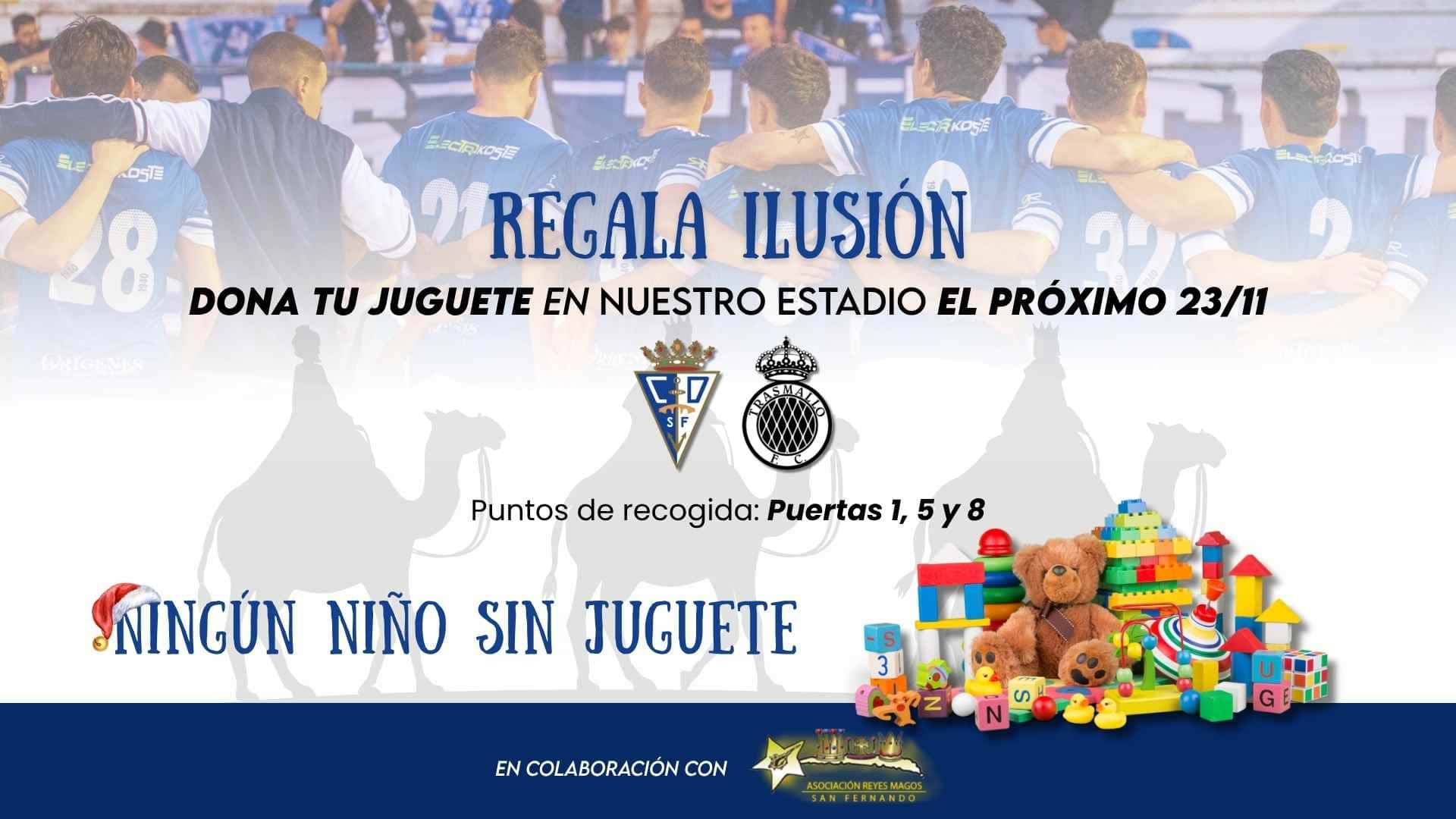 El CD San Fernando arranca la campaña de recogida de juguetes en colaboración con la Asociación Reyes Magos de San Fernando este próximo domingo ante el Trasmallo FC a las 17:00 h. El Club facilitará puntos de recogida de juguetes en las puertas 1, 5 y 8 para que todos los aficionados que así lo deseen donen juguetes para la campaña ‘Ningún Niño Sin Juguetes’ que busca que todos los niños/as de La Isla disfruten de un día especial el próximo 6 de enero.